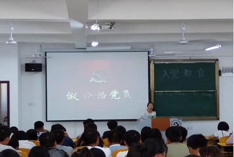 童老师通过幻灯片的形式为大家分别从党情介绍,党员要求,入党流程,入党动机等各个方面为新生做了全面的介绍。使同学们正确认识到入党对自身的要求及益处,大大提高了同学们对党的认识,端正了入党的态度,并树立了正确的入党动机。