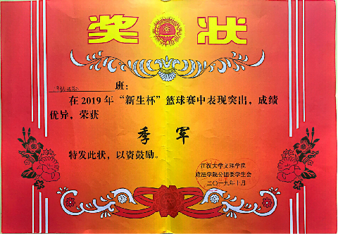 大学之育在于美学之育。19级法学二班韦占洋同学多次走上文理群星、元旦晚会等大型校级文艺活动的舞台,均获得较好名次,为公司的文艺事业做出了巨大的贡献,同时也为公司培养出一大批文艺青年。舒烨婕同学发挥创新思维,积极参加第十三届“挑战杯”并荣获省级三等奖。19级法学二班同学也活跃于各项领域,曾荣获乐天使“新生杯”篮球赛季军、“文理杯”足球赛团体赛冠军。