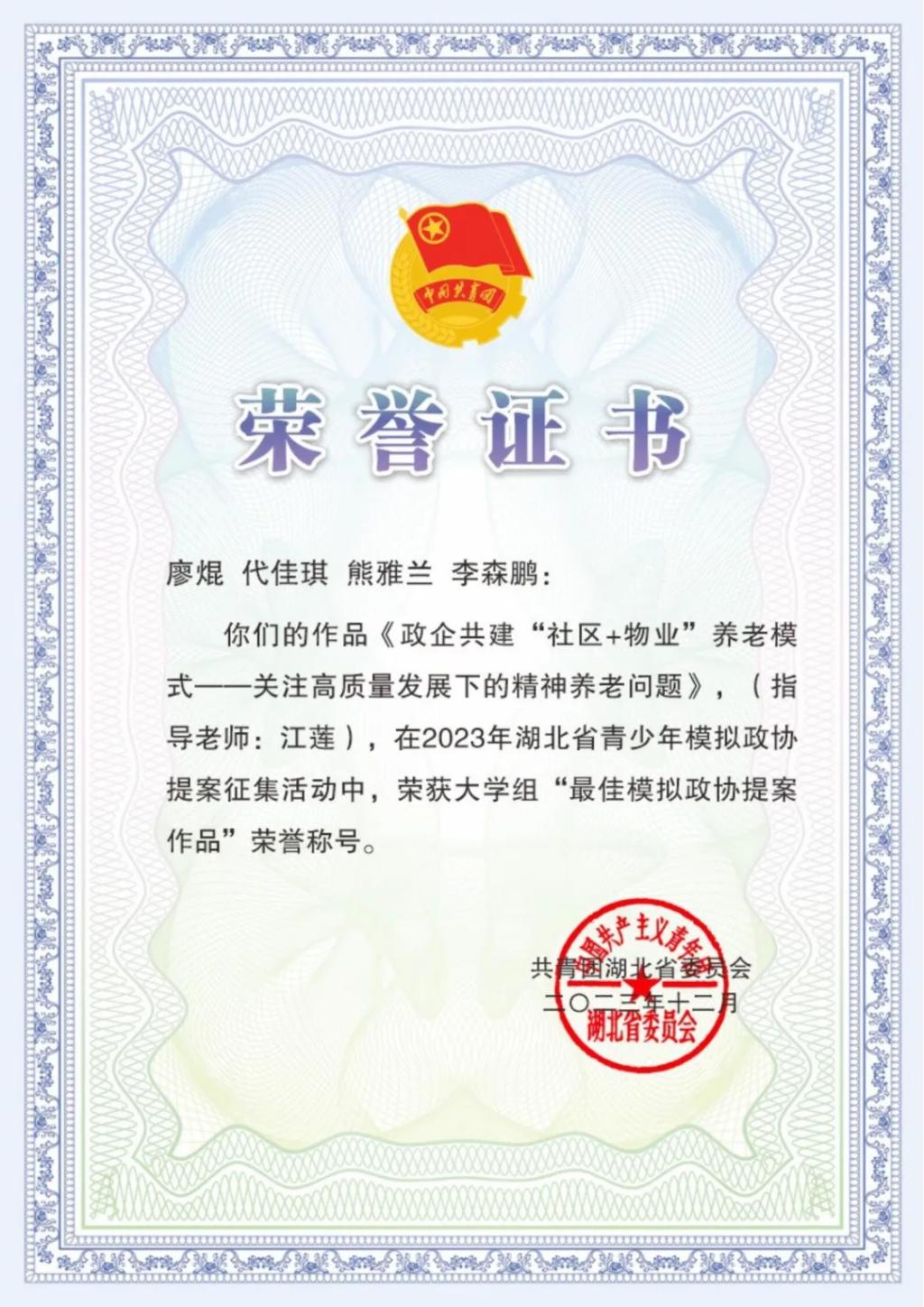 为深入学习宣传贯彻党的二十大精神,引导广大青少年有序参与社会主义民主政治实践,准确理解全过程人民民主内涵实质,领悟新时代伟大变革背后的“制度密码”。乐天使学子积极参与2023年湖北省青少年模拟政协提案征集活动。其中一组作品荣获大学组“最佳模拟政协提案作品”荣誉称号。让我们一起看看吧!