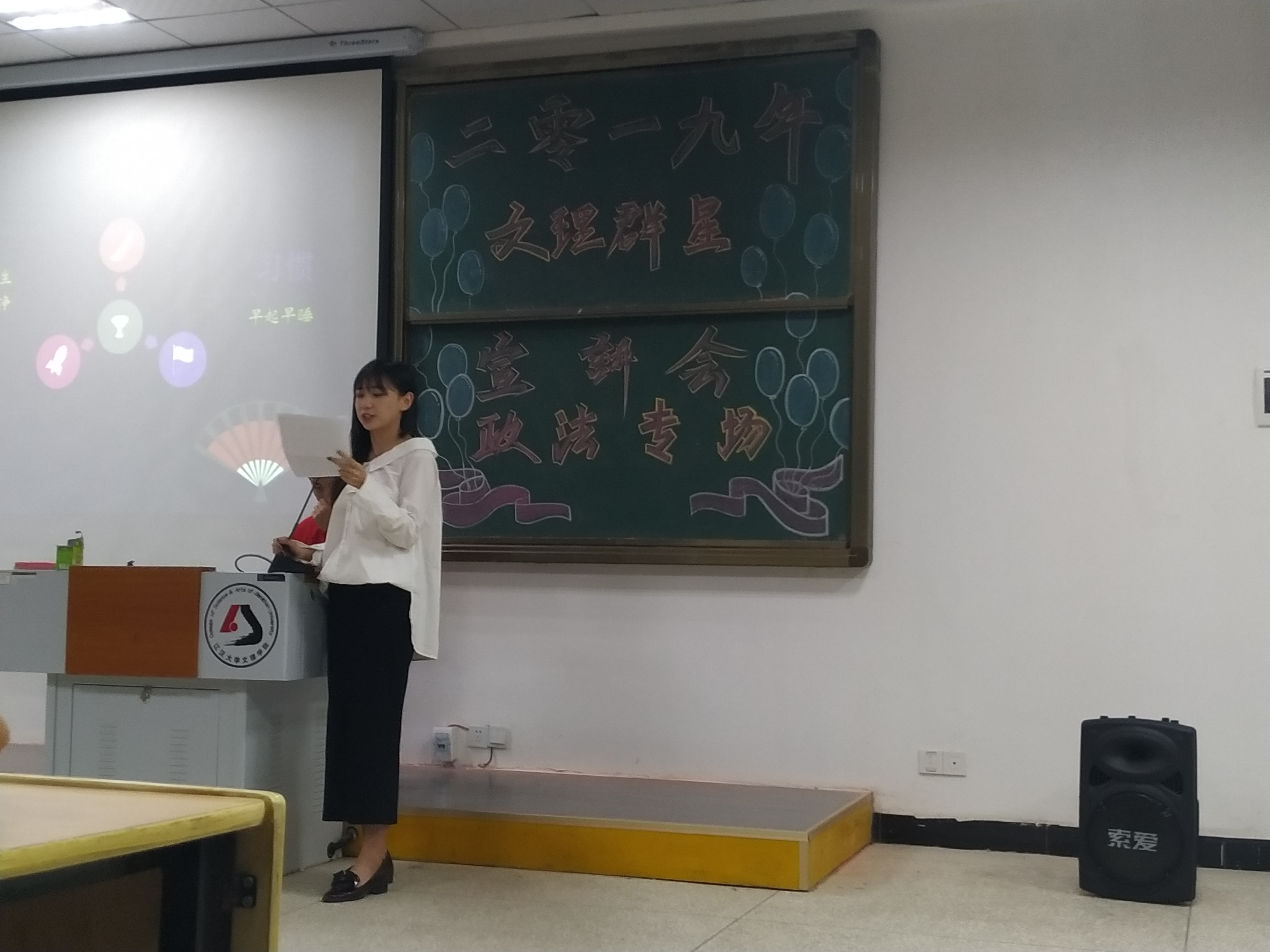 就这样,第一场宣讲会圆满结束,4月18日晚18点20分第二场宣讲会如期而至,经过主持人的开场白之后,宣讲人开始上台演讲。首先喻迪以及陶婉婷分别讲述自己的经历,后来便由“市见义勇为先进集体”获奖代表胡友军演讲。他三次下水去救自己的朋友,这样的勇气和对朋友深厚的感情深深打动了我们,遗憾的是其中一位已经永远的离开了我们。最后一位宣讲人是“突出才艺或得者”杨蕴,在她的演讲中,我看到了学前教育专业的亮点,也看到了小朋友们眼睛上的光,是多么的闪耀。