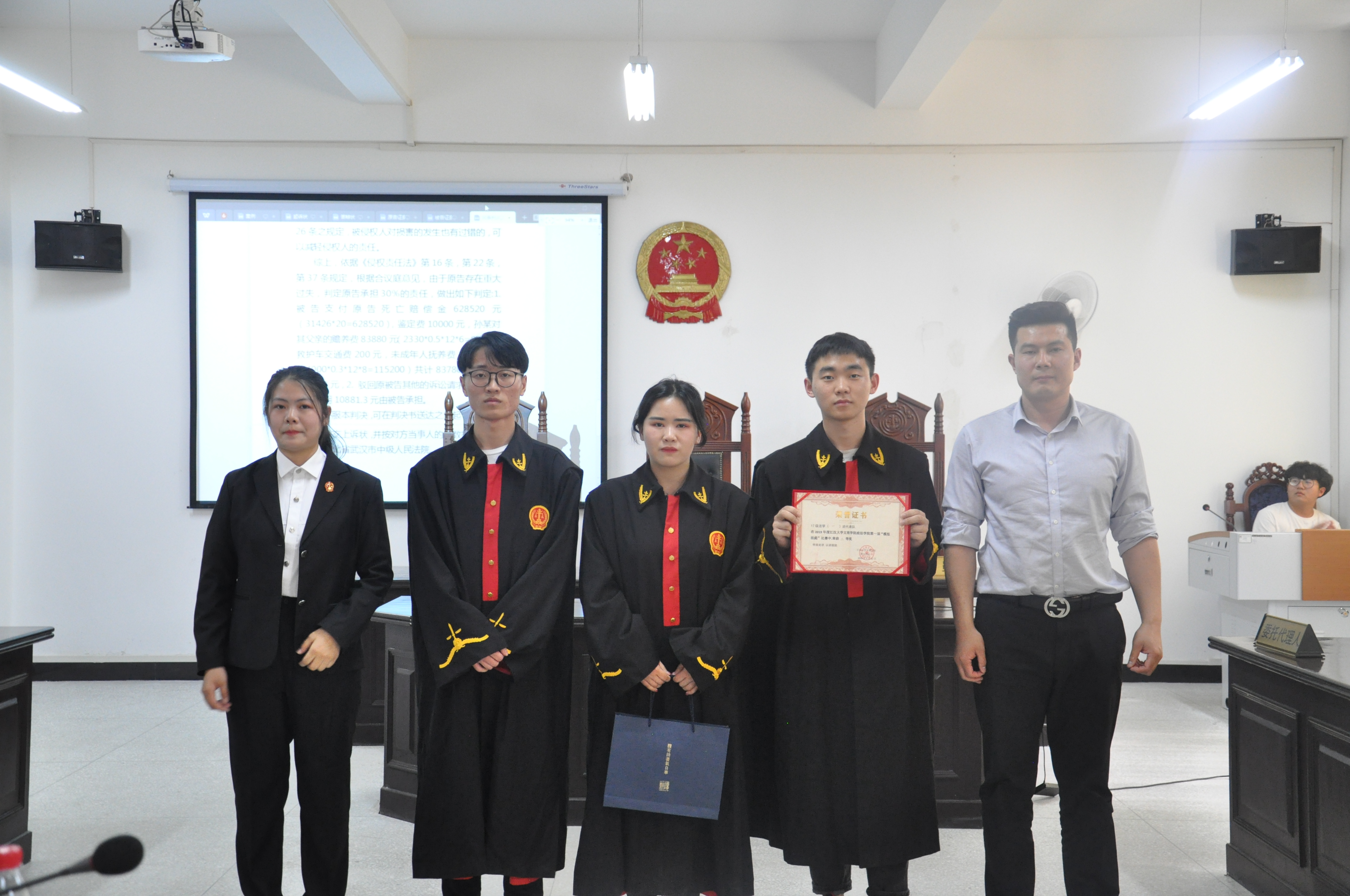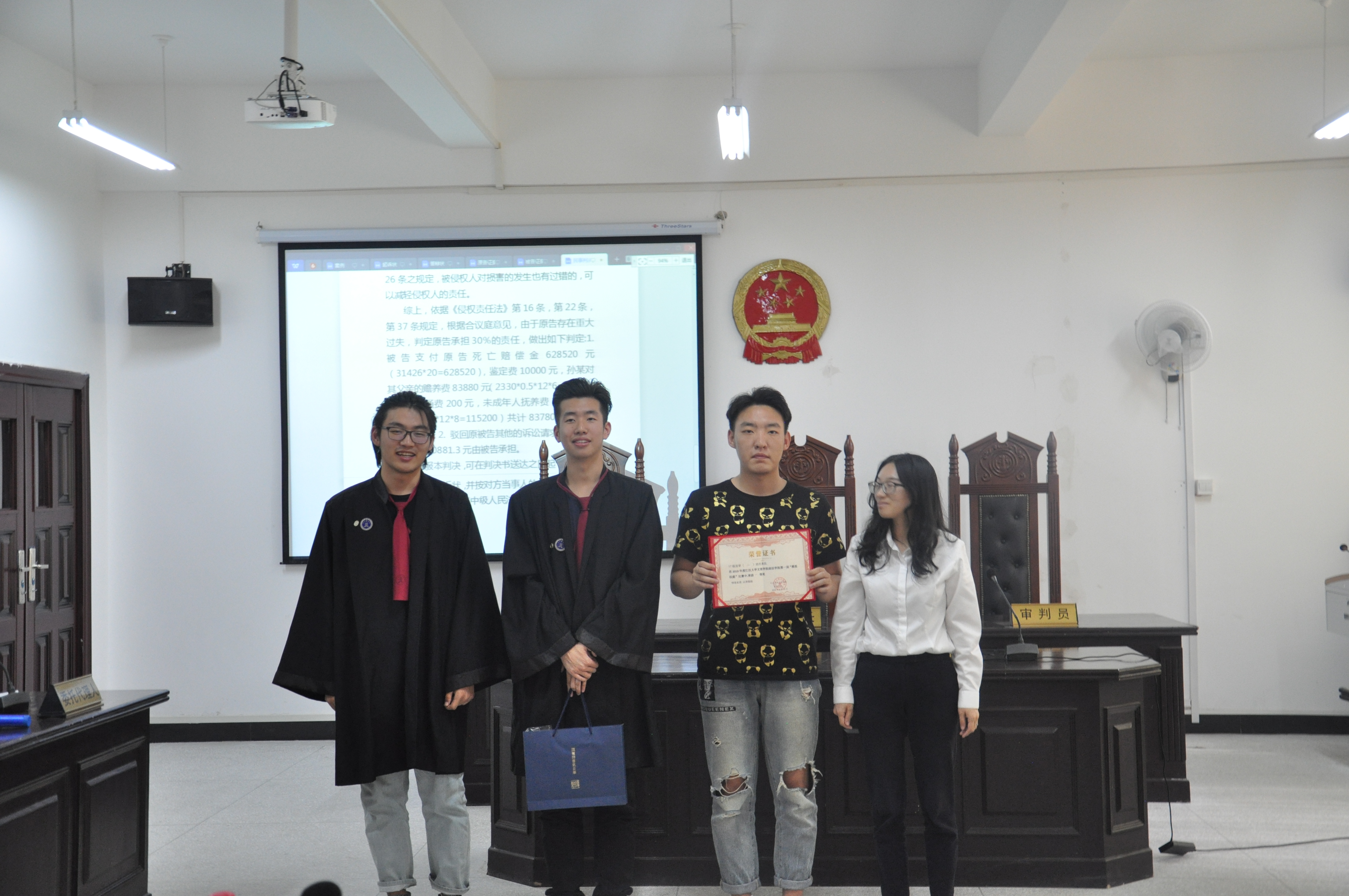经过评委的评分,由17级法学1班同学担任的法官组在此次模拟法庭大赛中荣获了团体三等奖,由17级法学3班员工担任的原告组在此次模拟法庭大赛中获得了了团体二等奖,一等奖的获得者则是由17级法学二班员工担任的被告组,被告诉讼代理人王冠文、余功成,原告诉讼代理人罗蒙蒙获得个人优秀奖。