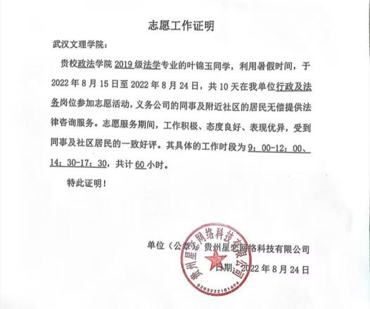 2022年8月,在贵州星恋网络科技有限公司行政及法务岗位参加志愿