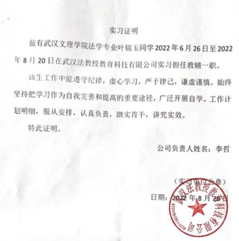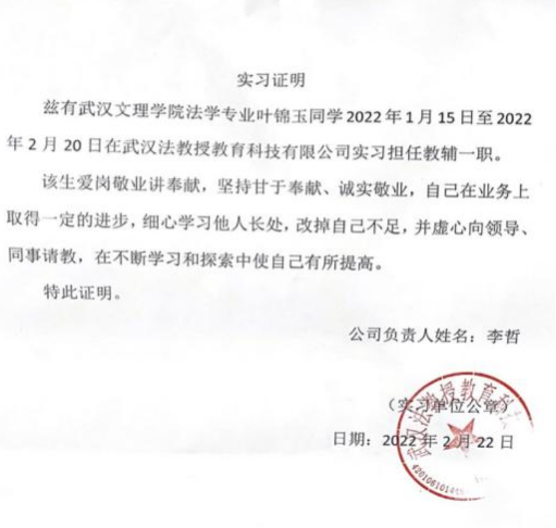 2022年1月至2022年8月,在武汉法教授教育科技有限公司担任法学教辅一职,负责解答法硕考生法律与英语相关专业问题。