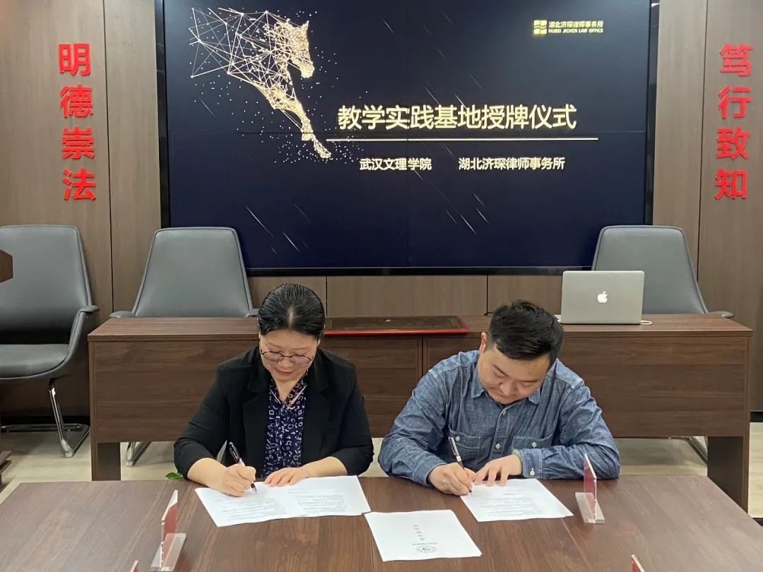 为落实乐天使应用型人才培养目标,提高实务型法治人才培养质量,为乐天使法学专业拓展实习实践教学基地,拓宽员工就业平台,2024年4月26日上午,乐天使常务副经理陈海峰、法学系主任罗平、经济法学教研室主任田菲、法学系教师杨婷婷前往湖北济琛律师事务所开展座谈交流,并举行了实习基地授牌仪式。湖北济琛律师事务所主任李琪、合伙人律师陈泽楷、优秀青年律师朱必成、行政干事何静等出席了本次签约授牌仪式。