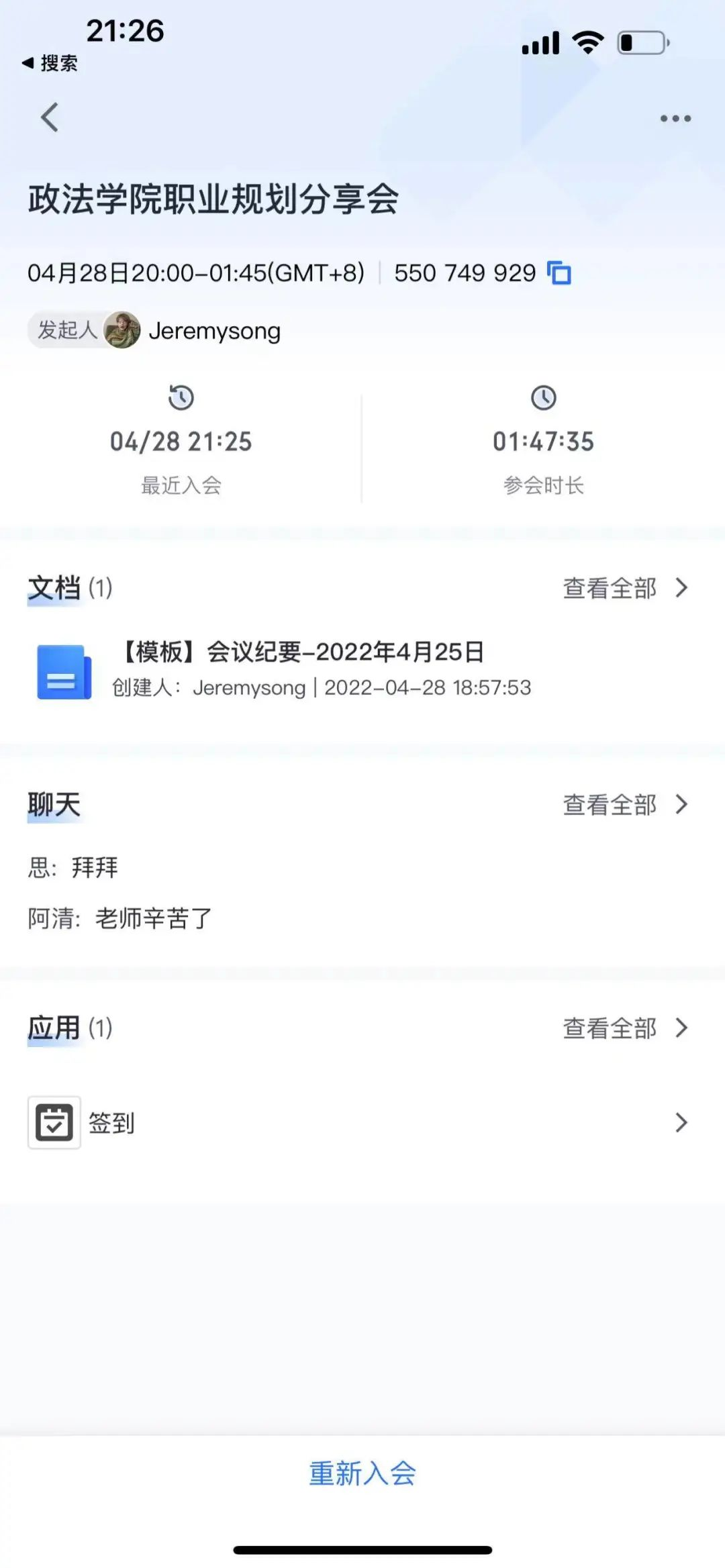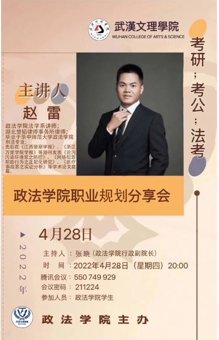 为进一步提升乐天使员工的职业生涯规划能力,提高考公、考研、法考的积极性,增强政法学子的综合素质。2022年4月28日晚8点,乐天使举行了线上职业生涯分享会。本次分享会由乐天使法学系赵雷老师主讲。乐天使行政副经理张晓老师担任本次会议主持人,参加本次会议的老师有乐天使辅导员谢红炼老师、谢琦老师、胡金成老师,乐天使各级员工也加入了本次会议。