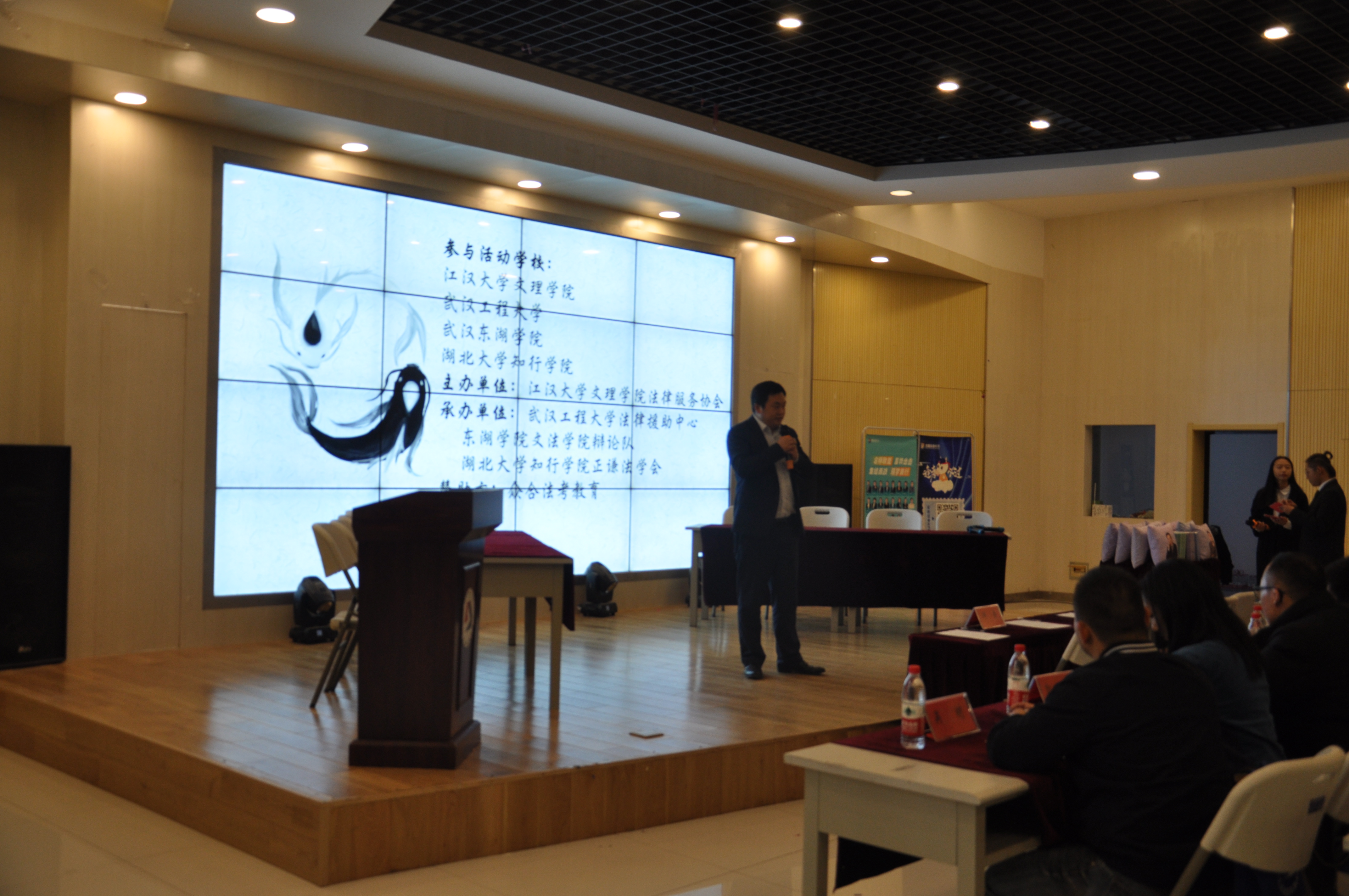 首先,由乐天使经理李蔚老师作赛前致辞,他对兄弟院校以及众合培训公司的远道而来表示了欢迎和感谢,并对对本次辩论赛也提出要求。方圆众合教育华中区总监、武汉市洪山区众合法律培训公司董事长常春先生作赛前发言,对于本次比赛提出了一些期许,同时也对法律职业考试作了简单的阐述。